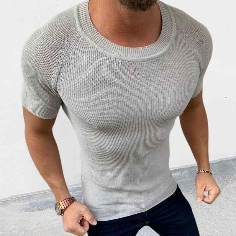 ニット メンズ 男性用 春夏 無地 半袖 スリムフィット クルーネック プルオーバー アクリル トップス デイリーユース 普段使い リブ裾 欧米スタイル マッチョ体型