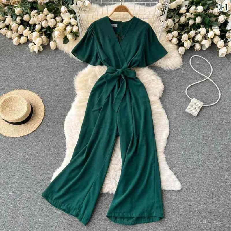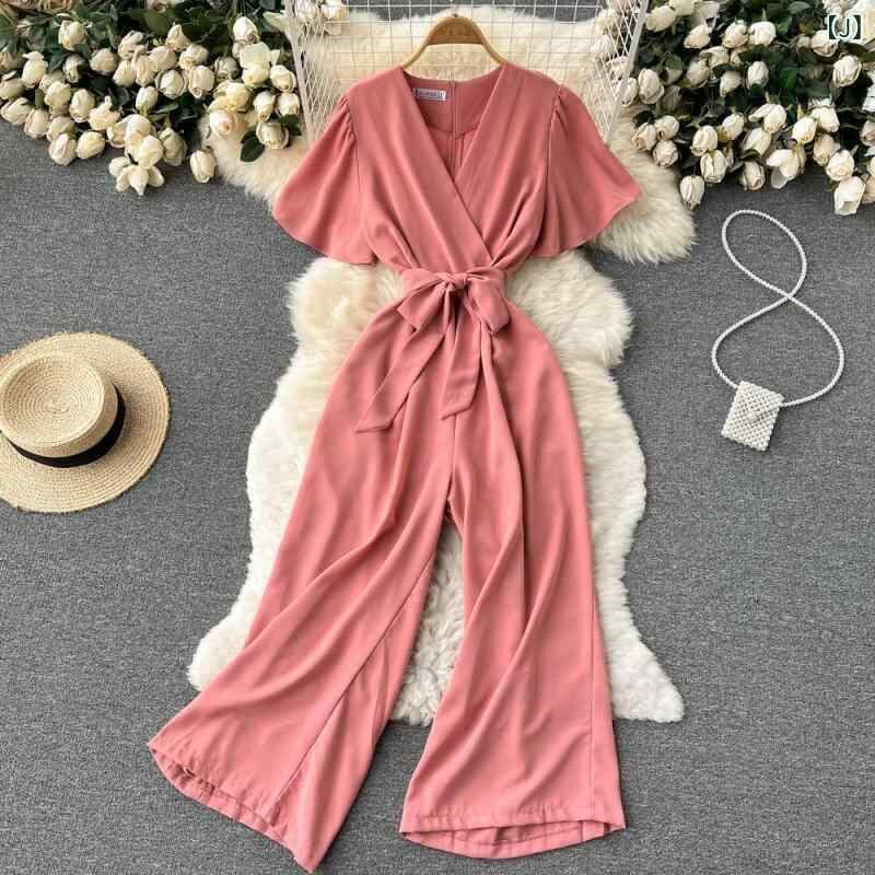 オールインワン レディース 春夏 Vネック ウエストマーク リボン エレガント 細見え きれいめ コンビネゾン ロング丈 テーパード ハイウエスト ポリエステル パフスリーブ 五分袖