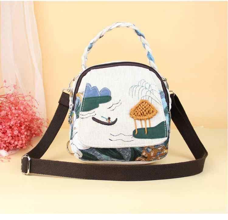 バッグ レディース 3WAY ハンド リュック ショルダーバッグ ミニスクエア 縦型 ハンドメイド 編み込み 山水柄 和風 麻混 ポリエステル裏地 ファスナー開閉 旅行 普段使い デイリーユース 秋冬