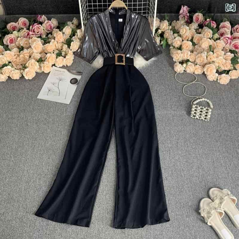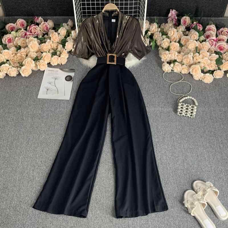 オールインワン レディース 韓国風 スパンコールベルト 無地 Vネック レトロ ヘップバーン風 ハイウエスト ワイドレッグ 着痩せ コンビネゾン