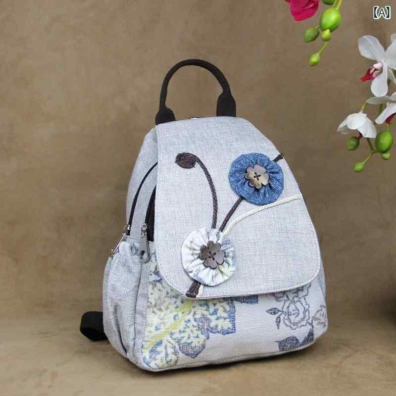 リュック レディース 女性用 レトロ エスニック 花柄 プリント 編み込み 綿麻 コットンリネン バックパック 通学 通勤 旅行 普段使い カジュアル ファスナー開閉 フラップポケット 春夏