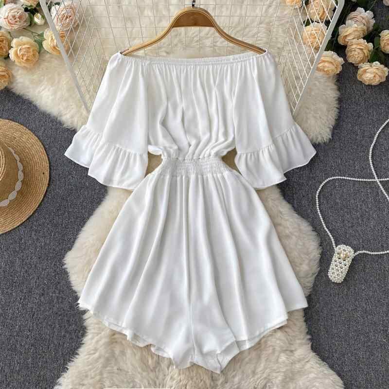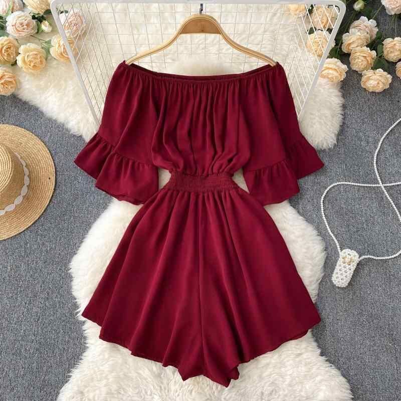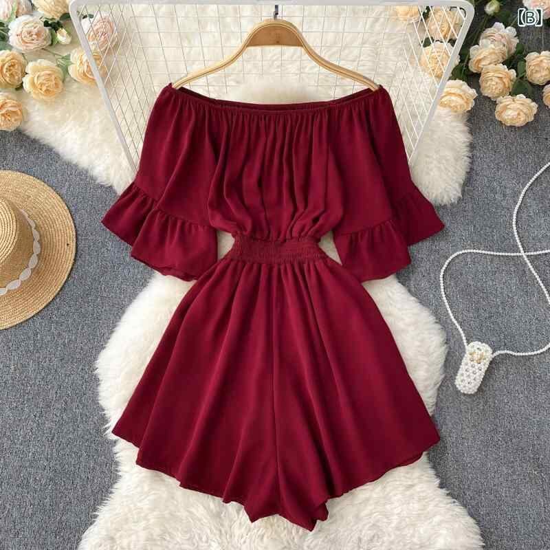 オールインワン レディース 春夏 リゾート オフショルダー ベルスリーブ ハイウエスト ショート丈 ワイドパンツ エレガント 上品 白 赤 カーキ 黒