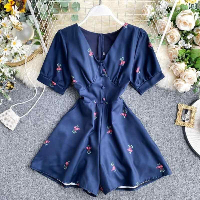オールインワン レディース Vネック 半袖 ウエストマーク ハイウエスト 着痩せ効果 体型カバー 花柄プリント ナチュラル 上品 カジュアル リゾート ワイドショートパンツ 春夏