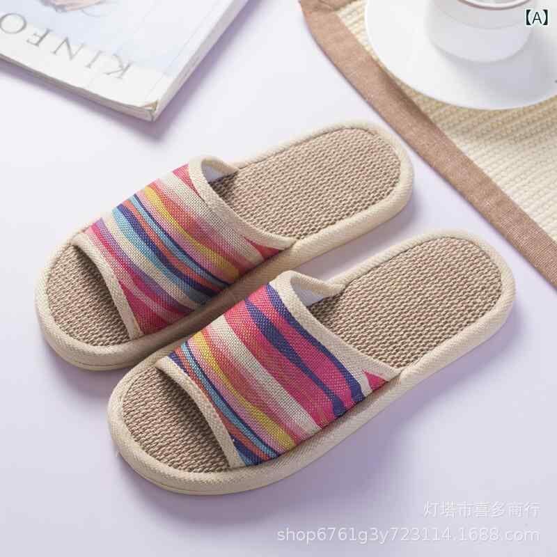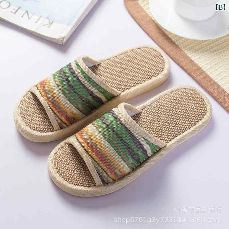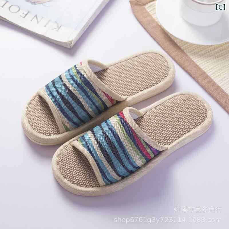 スリッパ 男女兼用 ペア 麻 リネン 涼しい 通気性 つま先カバー 室内履き 家庭用 フローリング 滑り止め グリップ ゴム底 縫製 ルームシューズ ボーダー柄