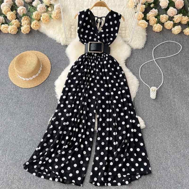 オールインワン レディース エレガント Vネック シフォン ストライプ柄 ウエストマーク ワイドパンツ ノースリーブ 韓国風 ロング丈 春夏 ポリエステル 通勤 カジュアル
