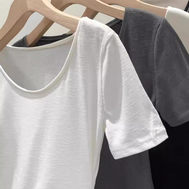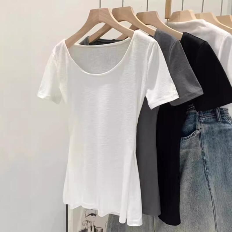 Tシャツ レディース 春夏 Uネック 半袖 鎖骨見せ ウエストマーク スリムフィット タイト 切り替え 個性的 無地 コットン トップス きれいめ 通勤 オフィス カジュアル