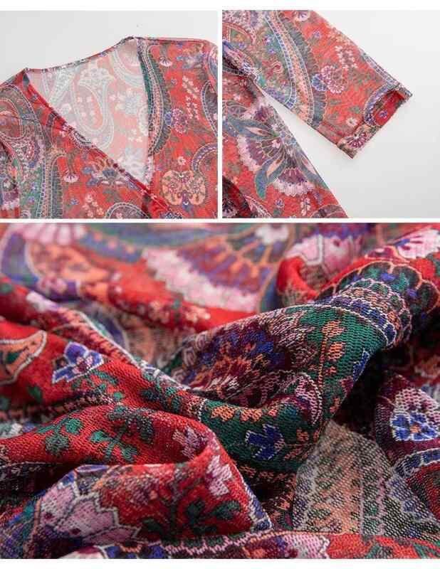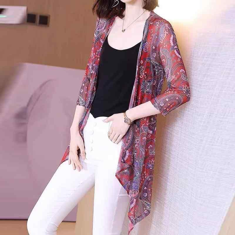 カーディガン レディース 春夏 薄手 冷房対策 UVカット ミドル丈 七分袖 プリント シアー Vネック 切り替え ポリエステル 上品 通勤 羽織り ショール