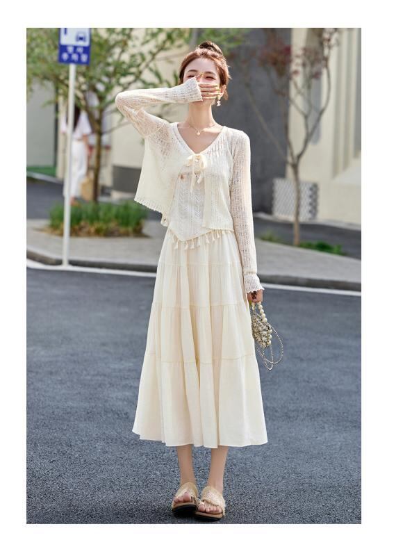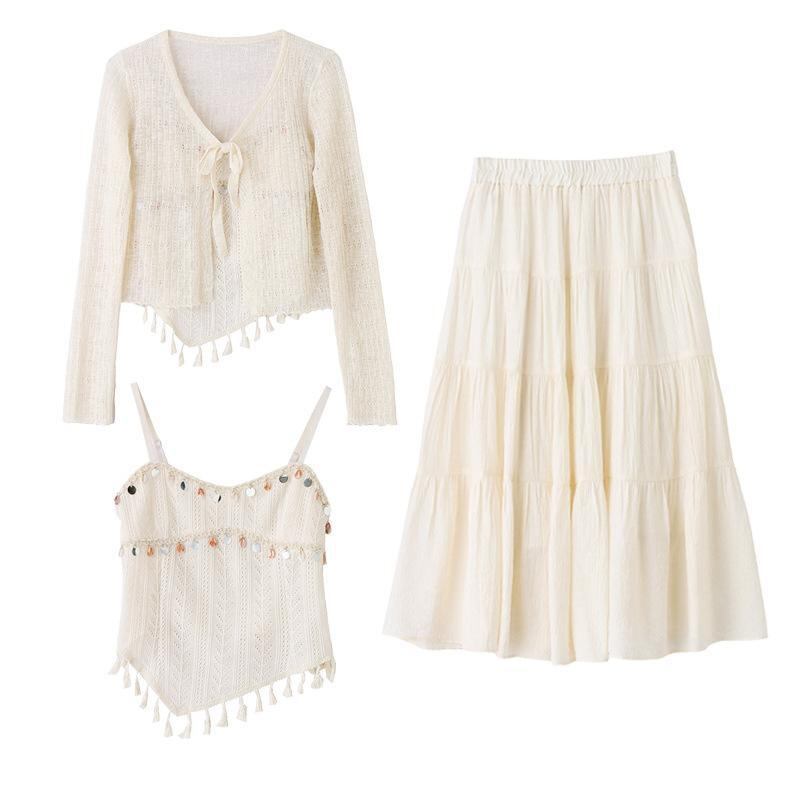 セットアップ レディース 高級感 春夏 UVカット 透かし編み 長袖 カーディガン フリンジ キャミソール ミディ丈 スカート ポリエステル 3点セット きれいめ 通勤 上品 ベージュ
