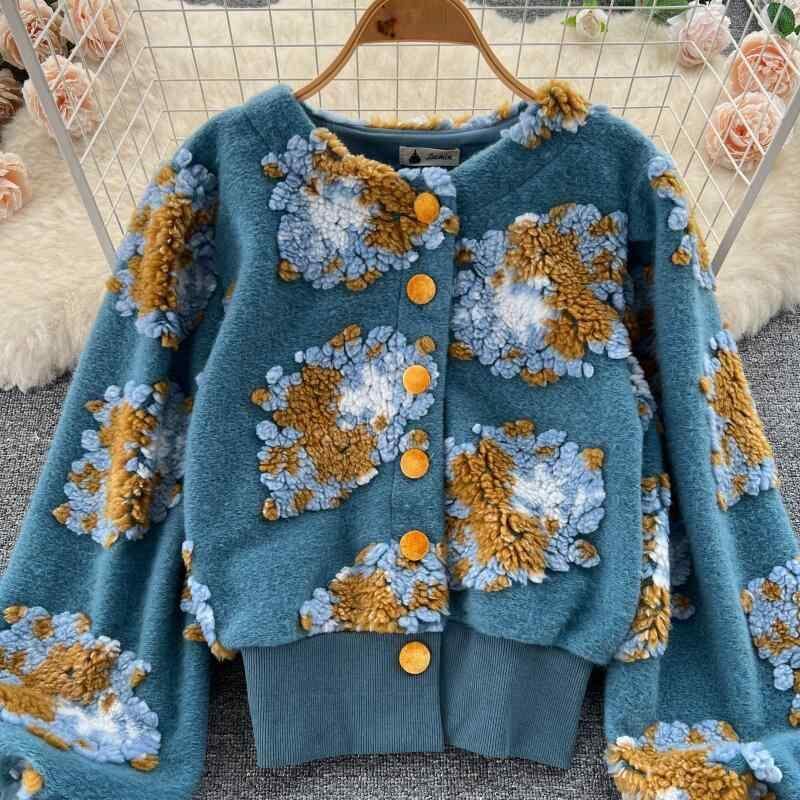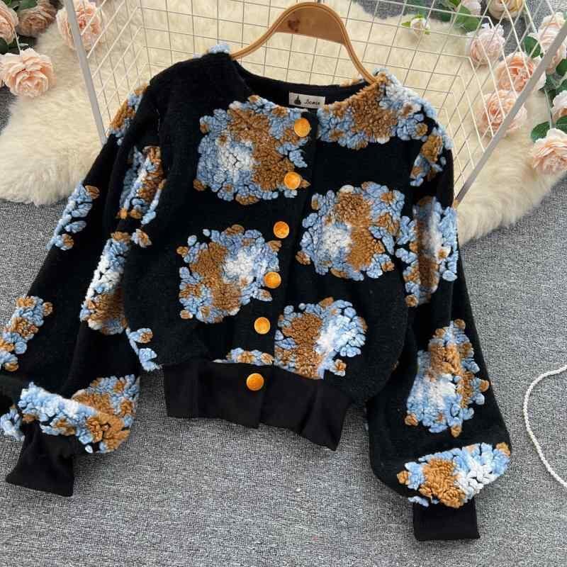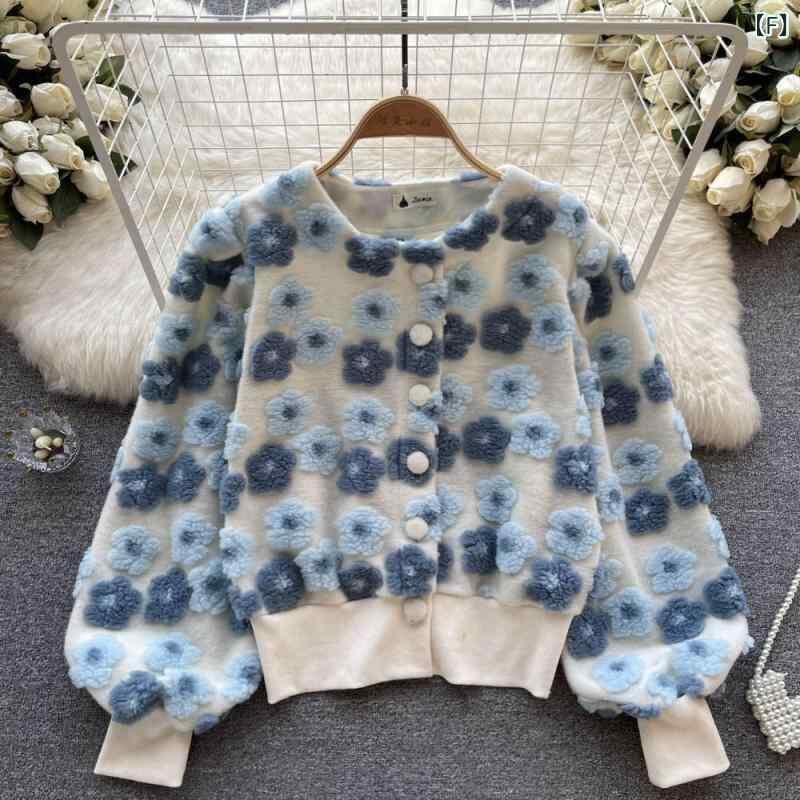 カーディガン レディース 秋冬 フレンチレトロ 立体花柄 上品 カジュアル シングルボタン ショート丈 ゆったり 厚手 フリース 長袖 クルーネック