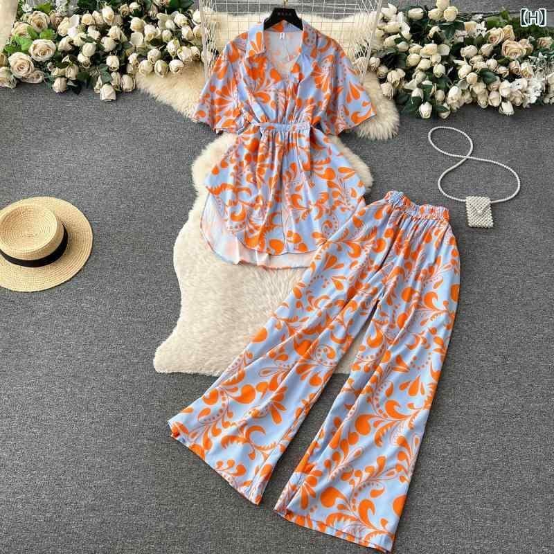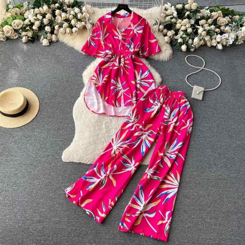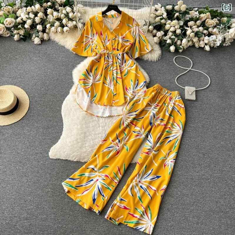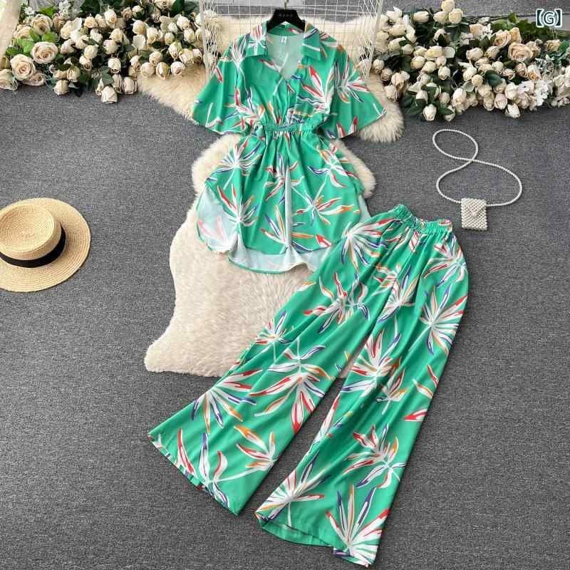 レディース セットアップ 小花柄 高級感 夏物 襟付き 半袖ブラウス ハイウエスト ワイドパンツ ドレープ感 カジュアル 上下セット