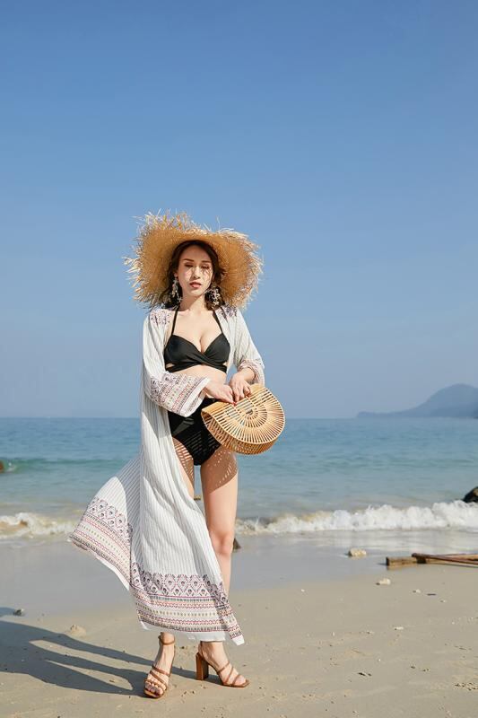 UVカットカーディガン レディース ミドル丈 薄手 ゆったり 体型カバー 花柄 ストライプ ビーチ リゾート 春夏 羽織り 綿混 9分袖 ホワイト フェミニン