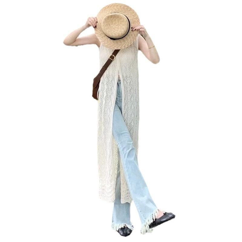 カーディガン レディース ボヘミアン風 透かし編み スリット ノースリーブ レイヤード ニット ミドル丈 春夏 アクリル 羽織り リゾート アイボリー