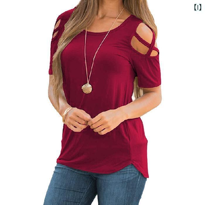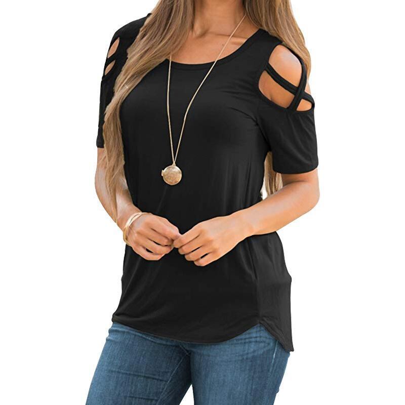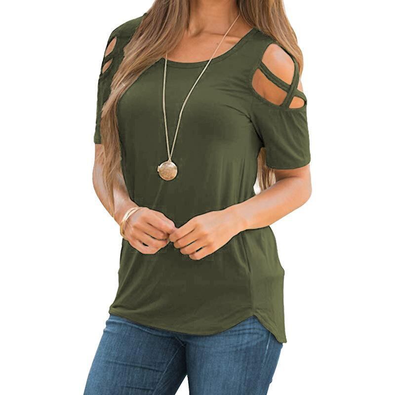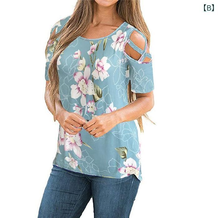Tシャツ レディース オフショルダー 半袖 ラウンドネック おしゃれ カジュアル ゆったり 欧米風 春夏 小花柄 配色 縦ストライプ 3Dプリント カットアウト 切り替え ポリエステル スパンデックス トップス