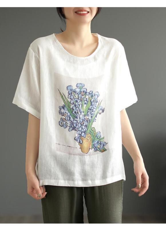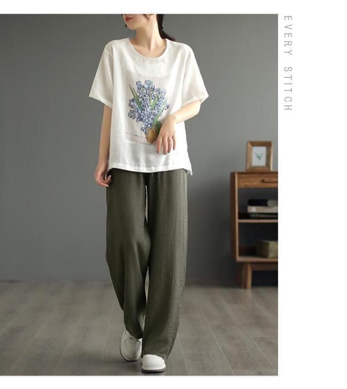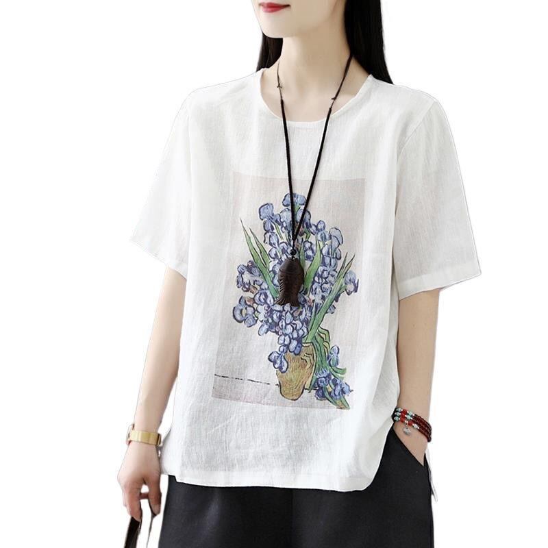 トップス レディース Tシャツ 春夏 ビッグサイズ ゆったり きれいめカジュアル 花柄 綿麻 半袖 ラウンドネック 通勤 普段使い