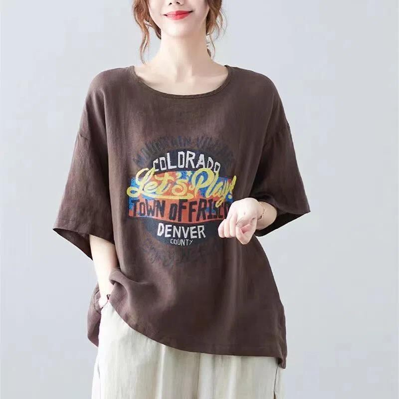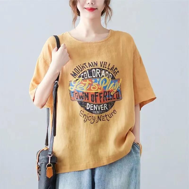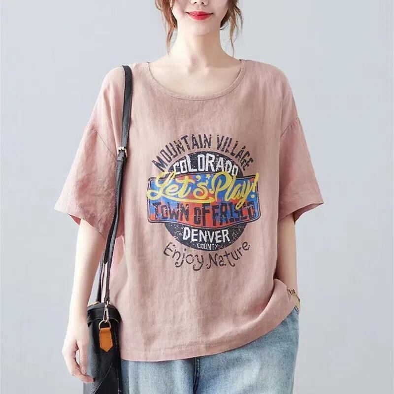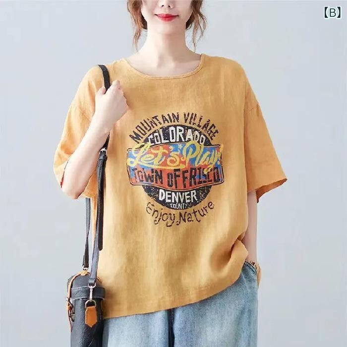 Tシャツ 春夏 ゆったり オーバーサイズ ラウンドネック 半袖 綿麻 アルファベット柄 プリント トップス カジュアル エレガント 普段使い 通勤 ピンク イエロー ブラウン ナチュラルカラー