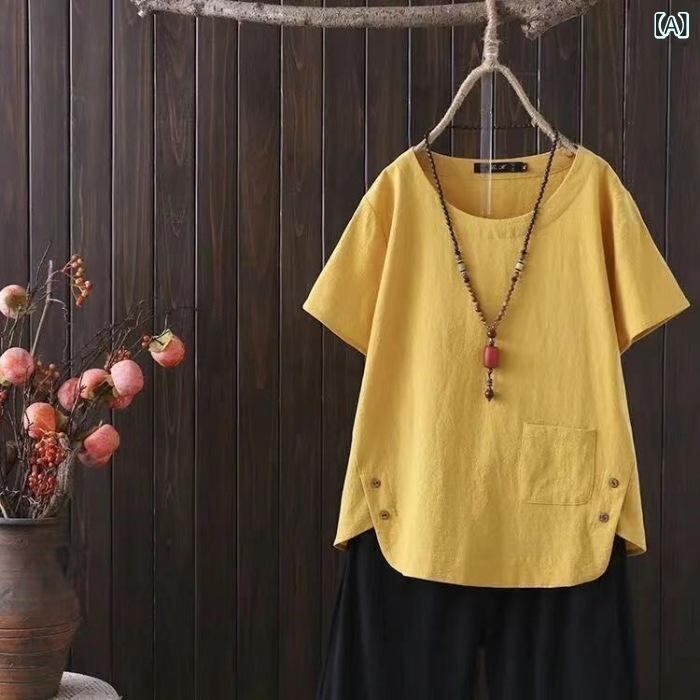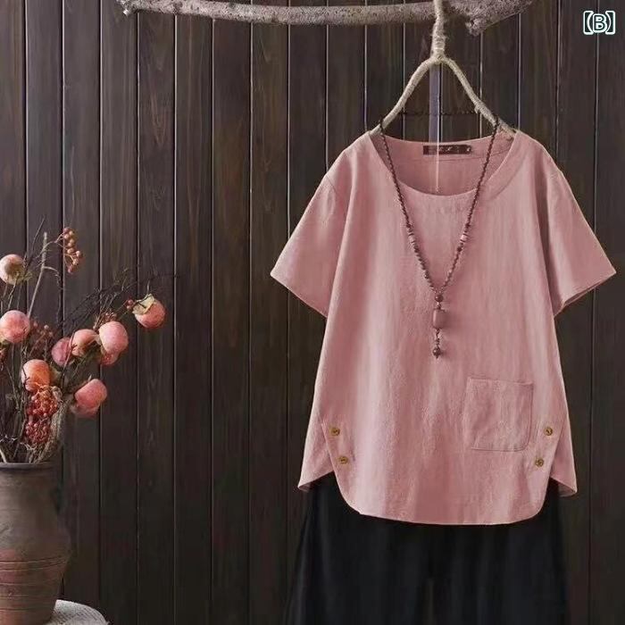 トップス レディース 春夏 大きいサイズ ゆったり ビッグシルエット 半袖 Tシャツ 綿麻 無地 切り替え クルーネック レトロ カジュアル 普段使い エレガント カットソー