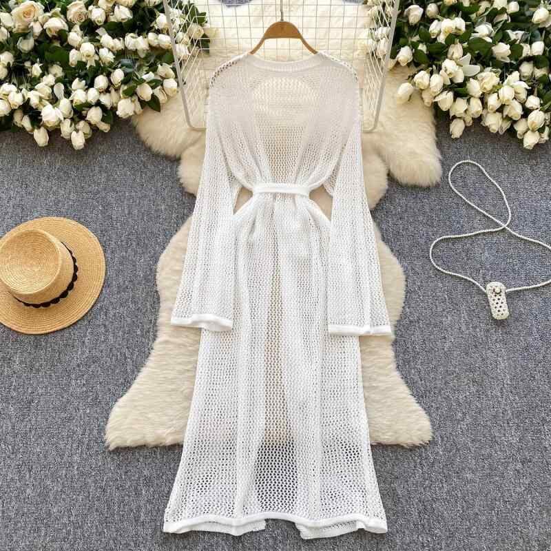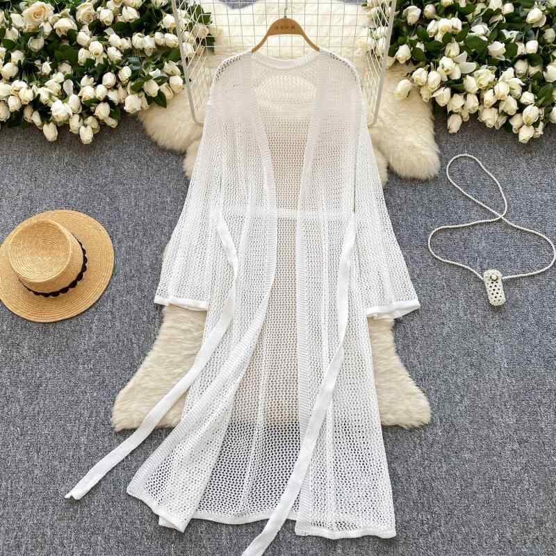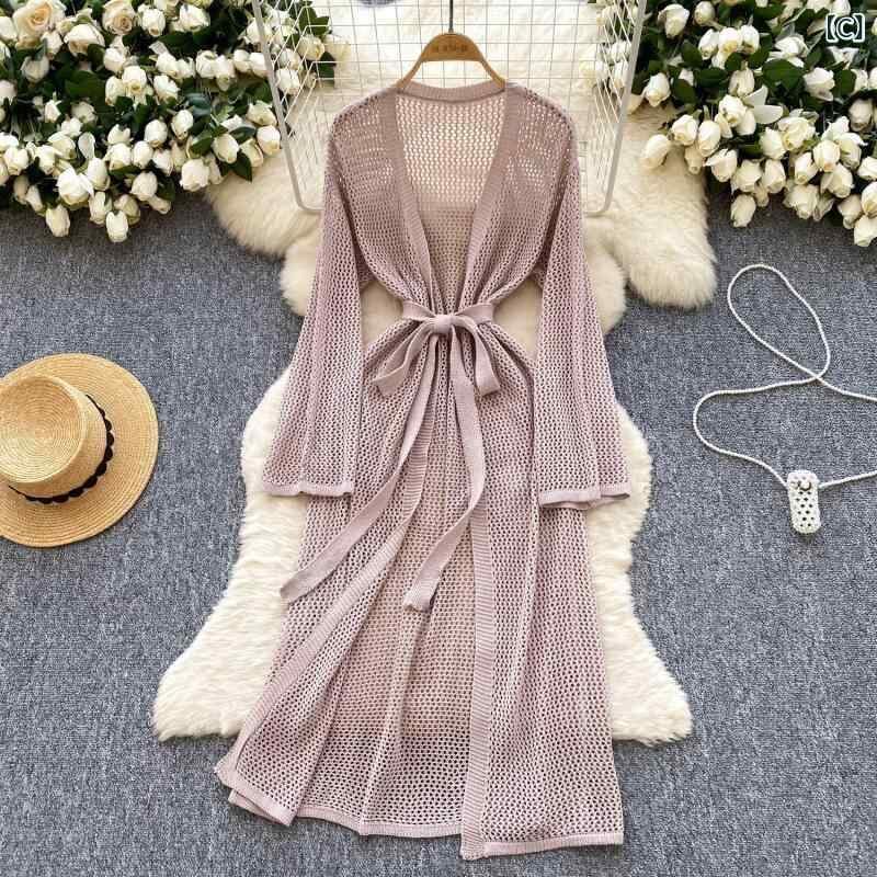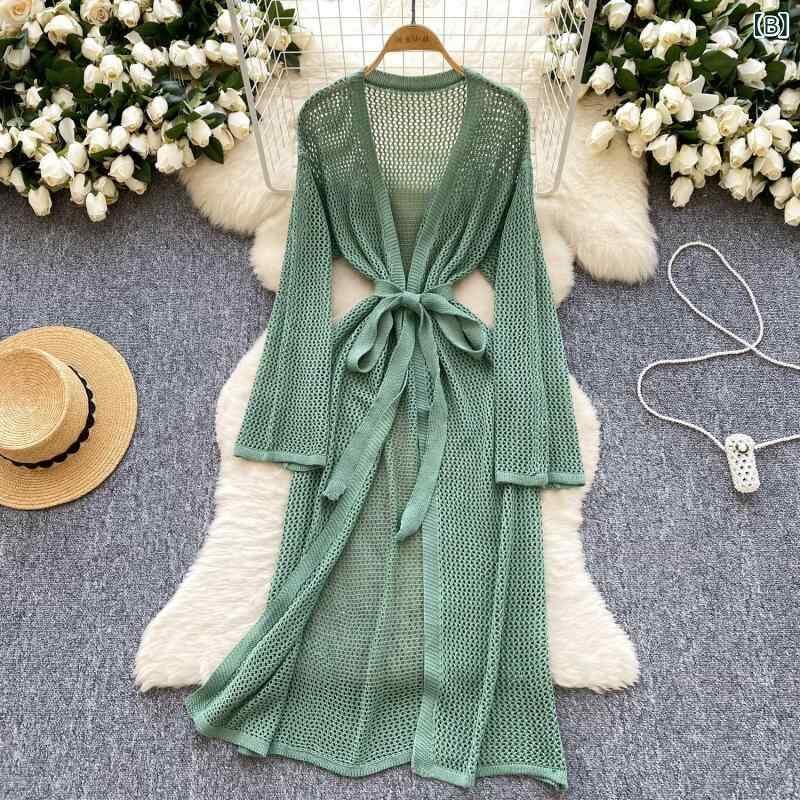 カーディガン レディース ニット 上品 シンプル 透かし編み Vネック 長袖 ウエストマーク ミドル丈 UV対策 通気性 ポリエステル 春夏 羽織り きれいめ カジュアル