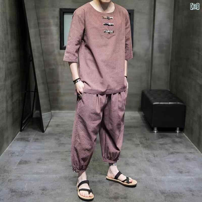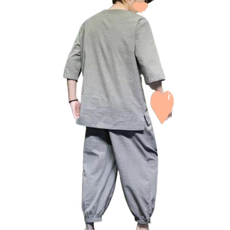 セットアップ メンズ 新チャイナ風 禅スタイル レトロ 普段使い 綿麻 コットン リネン 飾りボタン Tシャツ 2点セット リラックスウェア 夏 グレーグリーン ブラウン
