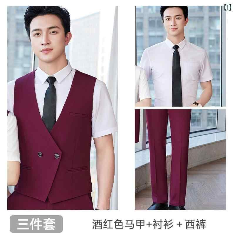 ベスト 男女兼用 ユニセックス シャツ ブラウス ホテル フロント 受付 飲食店 レストラン 接客 美容院 エステ 制服 ユニフォーム ビジネス 業務用 セットアップ スーツ Vネック スリムフィット 無地 ポリエステル 夏 サマー