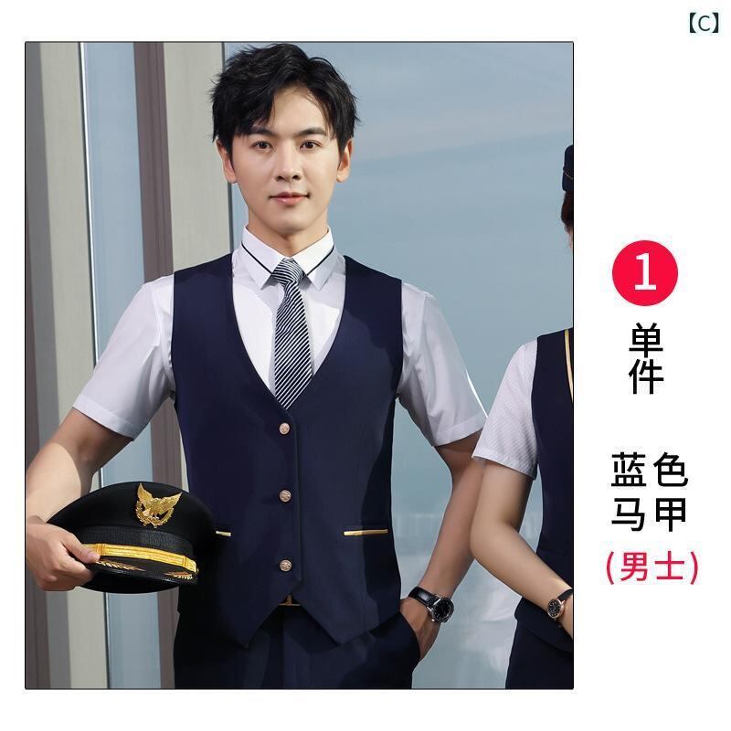 ベスト メンズ 男性 夏用 Vネック ショート丈 制服 パイロット 客室乗務員 高速鉄道 作業服 面接 通勤 オフィス ビジネス フォーマル スーツ セットアップ ポリエステル ストレッチ ブルー 青
