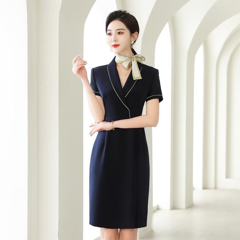 ワンピース レディース オフィス ビジネス 通勤 事務服 受付 上品 エレガント 高級感 Vネック 半袖 ミディ丈 タイトシルエット ハイウエスト 無地 ポリエステル 濃紺 夏