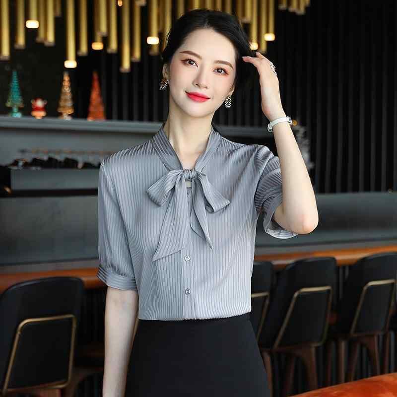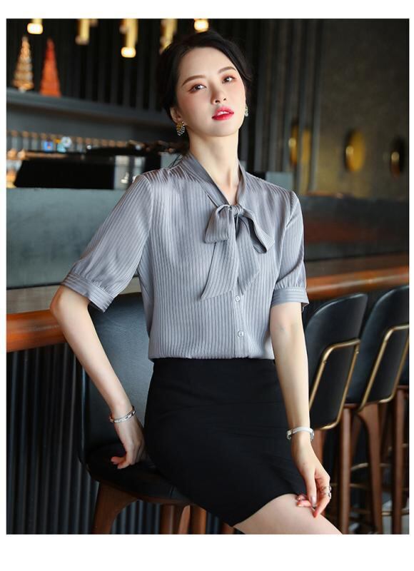 ブラウス レディース 韓国ファッション リボンタイ 半袖 シフォン Vネック デザイン フェミニン オフィス 通勤 カジュアル 春夏 ブルー ポリエステル