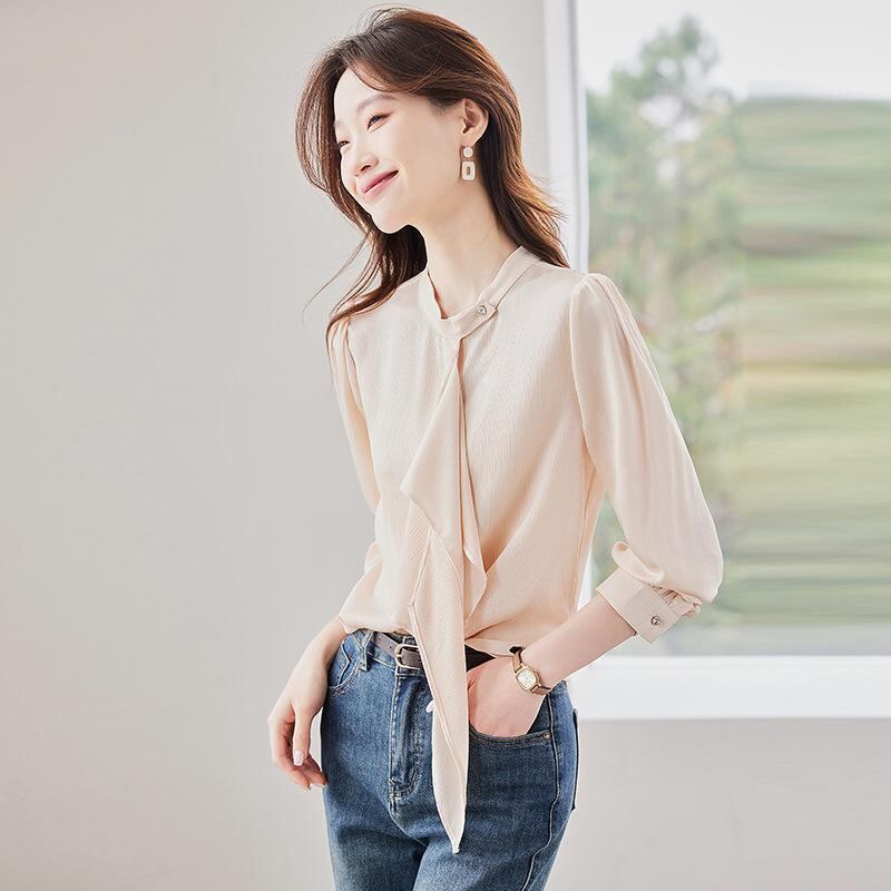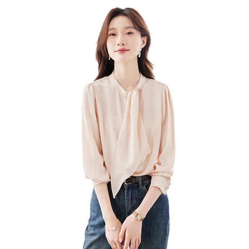 ブラウス レディース ボウタイ リボン 長袖 スタンドカラー エレガント 上品 ドレープ とろみ 無地 白 アプリコットカラー ポリエステル シワになりにくい オフィス 通勤 春秋 トップス