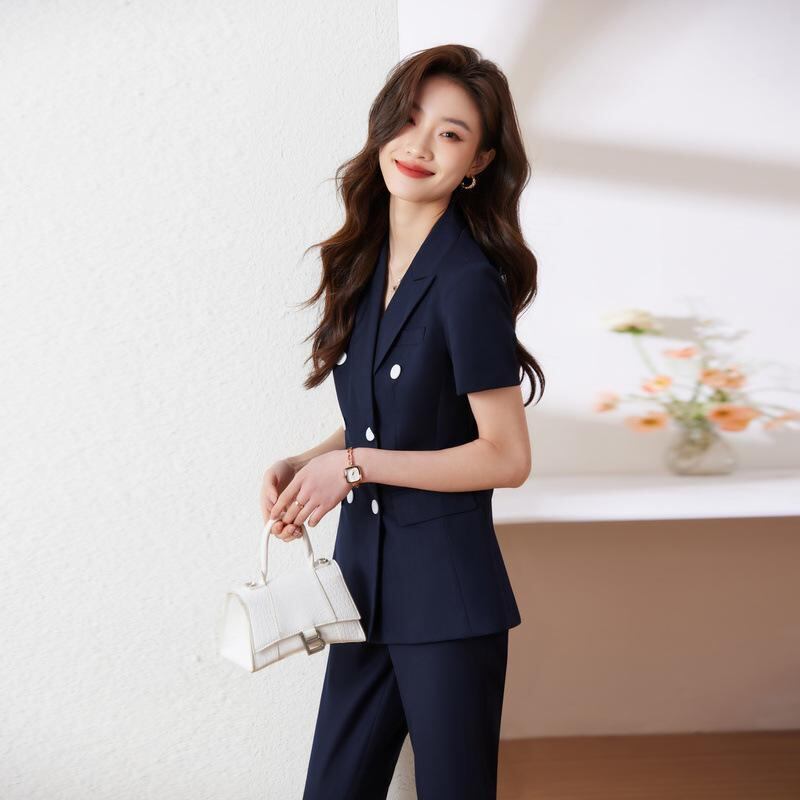 スーツ レディース ダブルブレスト 半袖 ジャケット セットアップ パンツ ピンク スリム 細身 ポリエステル オフィス ビジネス 通勤 就活 面接 リクルート フォーマル きれいめ 春夏
