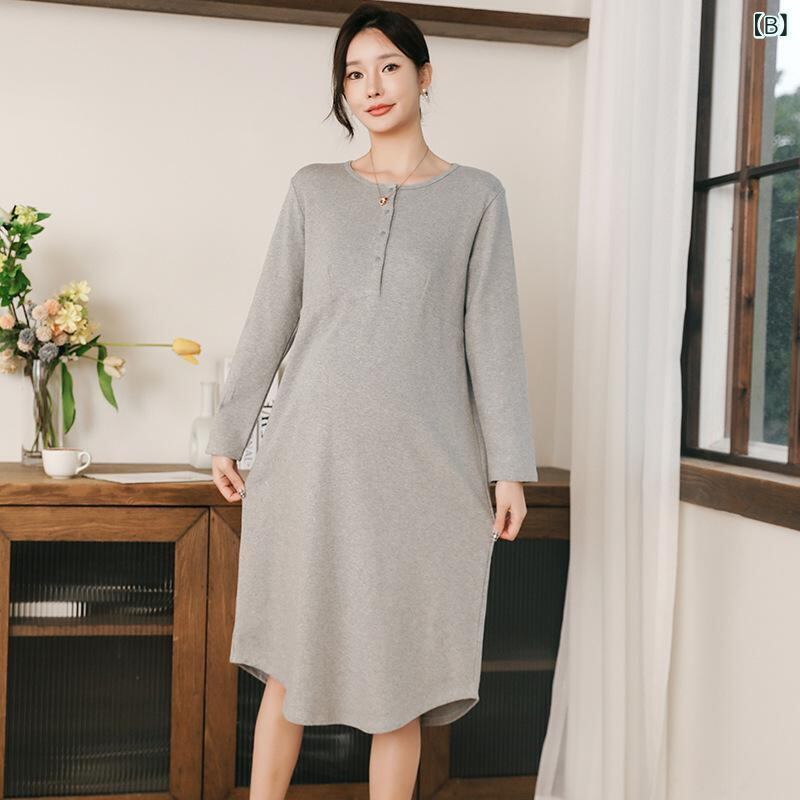 レディース ワンピース マタニティ 妊婦 産後 授乳服 綿 ブラなし パジャマ ルームウェア ロング丈 ラウンドネック 長袖 高ウエスト 入院 陣痛 分娩 黄色 青 灰色 紫 ピンク
