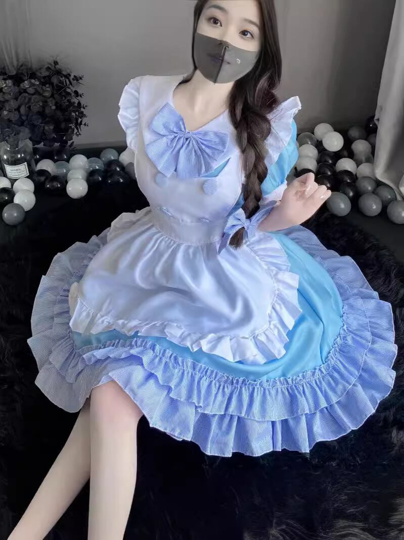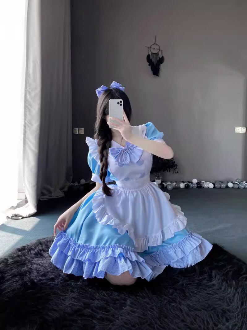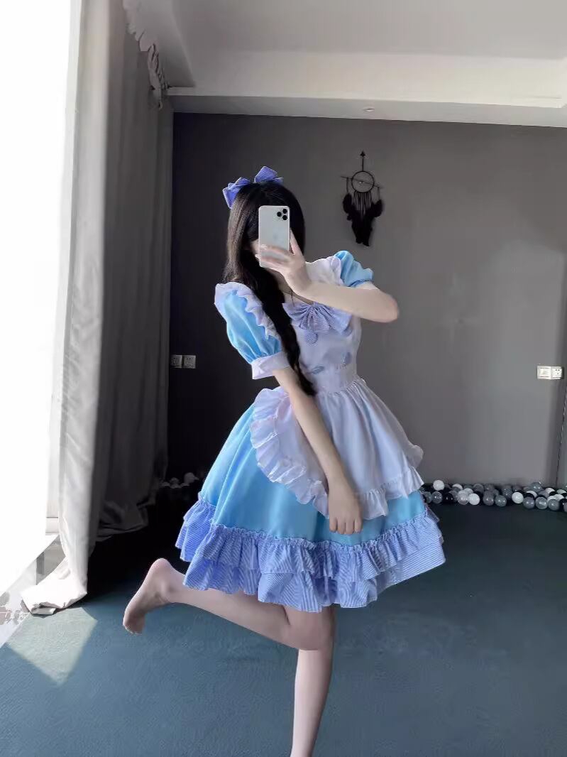 ワンピース レディース 青白 バイカラー メイド服 ロリータ 日系アニメ コスプレ 衣装 普段使い イベント パーティー ポリエステル素材 春夏 甘め 清楚系