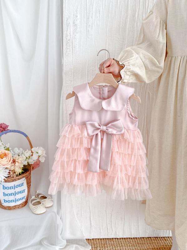 ワンピース 女の子 ベビー 夏 シャンパンピンク 丸襟 プリンセスライン ティアード フリル ノースリーブ 綿100% 赤ちゃん 誕生日 100日祝い セレモニー フォーマルドレス