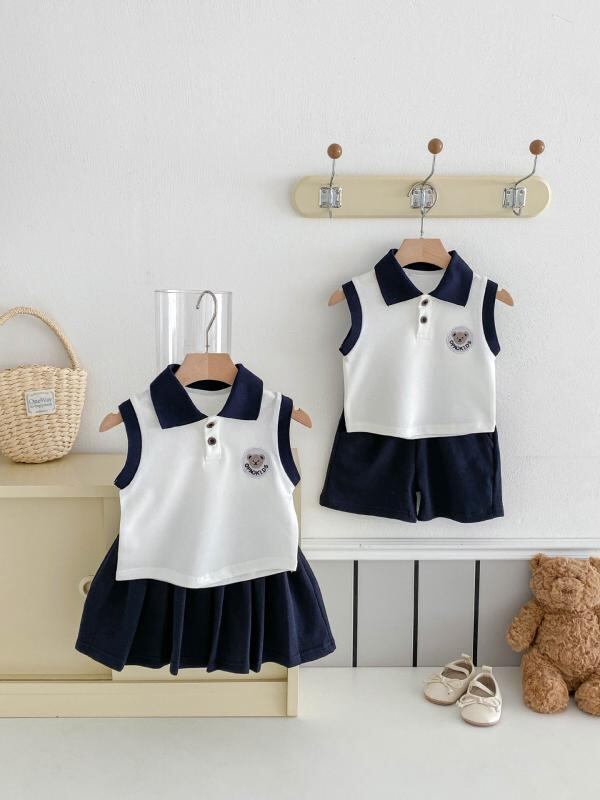 キッズ 女の子 幼児 上下セット 韓国風 ファッション ポロ襟 ノースリーブ トップス 薄手 コットン フレアスカート ツーピース 春夏 カジュアル かわいい