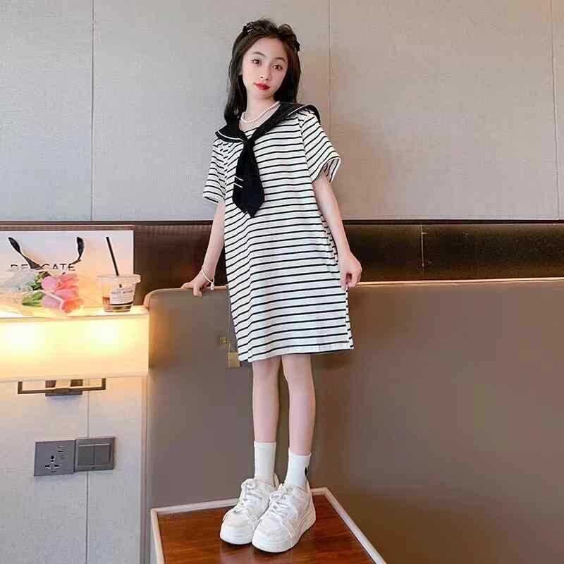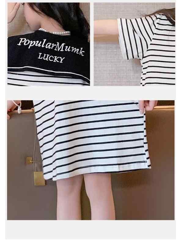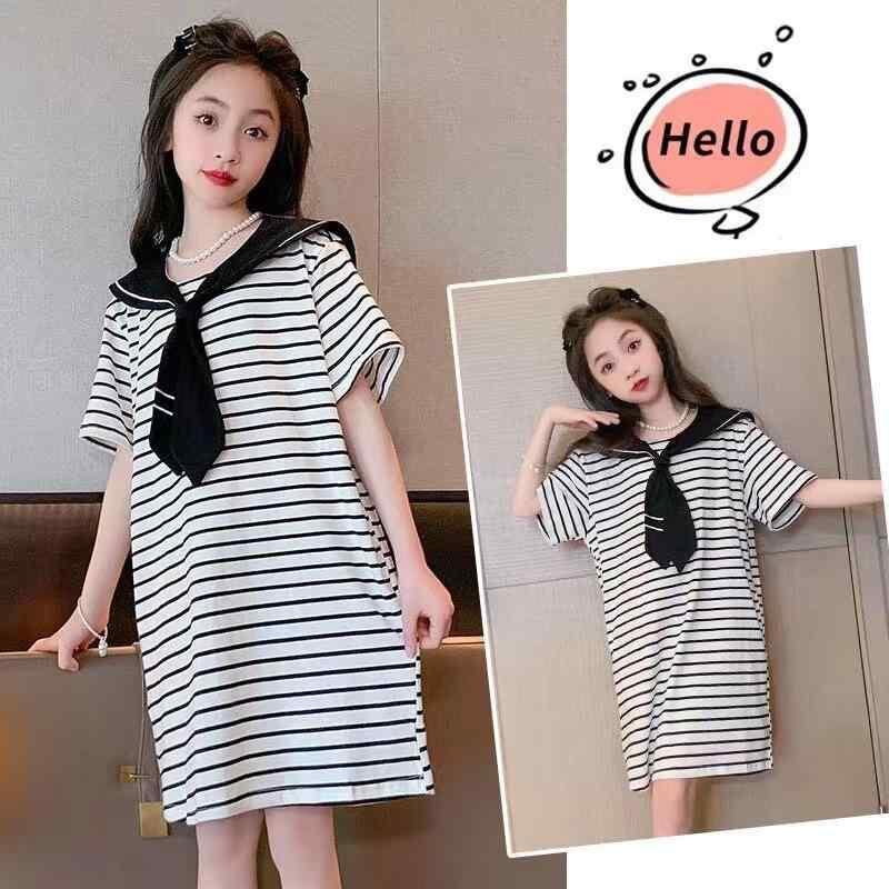 ワンピース キッズ 女の子 襟付き ストライプ柄 半袖 ロング丈 スクール風 プレッピー カジュアル 普段使い 通学 お出かけ おしゃれ かわいい 春夏