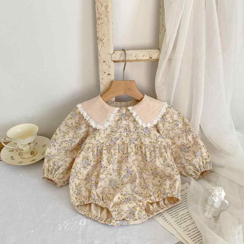キッズ 女の子 ベビー ワンピース ロンパース 春秋 韓国風 小花柄 フリル 付け襟 丸襟 長袖 Aライン 綿 コットン 姉妹コーデ お揃い プリンセス風 柔らか素材