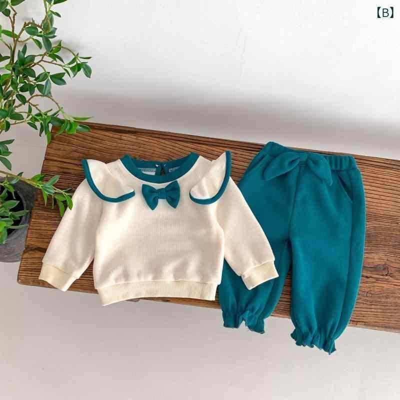 女の子 ベビー キッズ セットアップ フリル袖 長袖 トップス ロングパンツ 2点セット 春秋 韓国風 綿 薄手 無地 おしゃれ ピーチ 孔雀グリーン 普段使い カジュアル