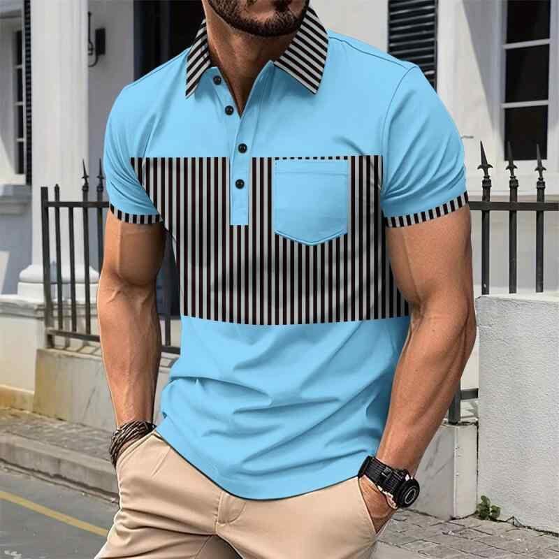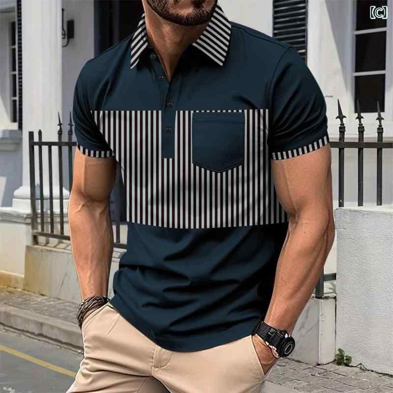ポロシャツ メンズ カジュアル ゆったり ストライプ 配色切り替え ボタン付き ロングプラケット ポケット付き 綿混 ポリエステル 春夏