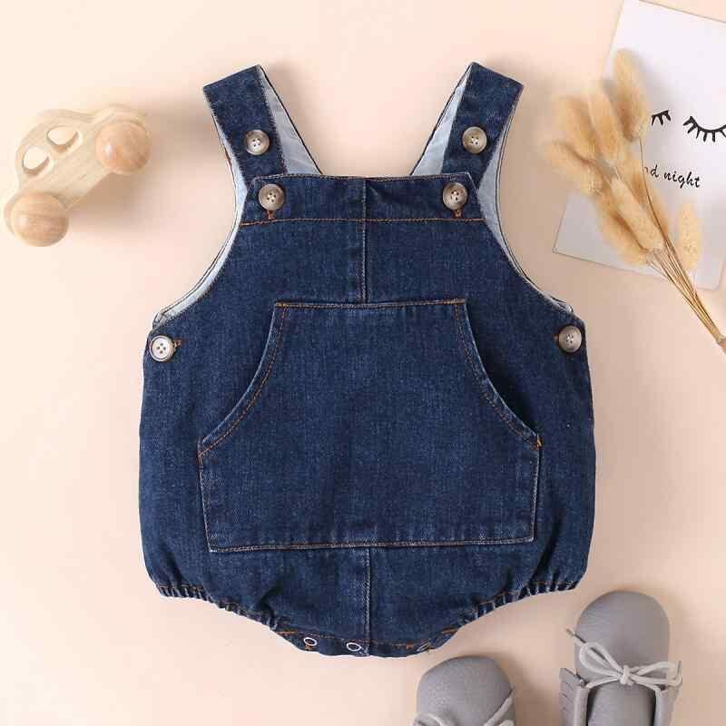 ロンパース ベビー キッズ 男女兼用 デニム オーバーオール 股下スナップ ボタン開閉 ポケット付き コットン 春夏秋 カジュアル 普段使い お出かけ着