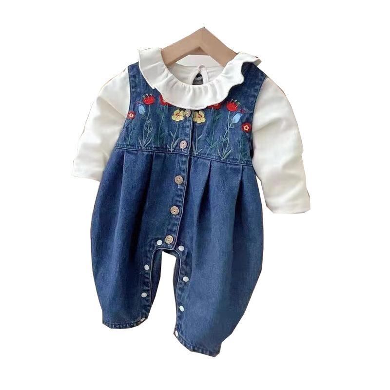 ベビー服 女の子 ロンパース デニム サロペット 2点セット 春秋 長袖 カジュアル おしゃれ 綿 コットン 柔らかい 快適 普段使い お出かけ デニムブルー 刺繍