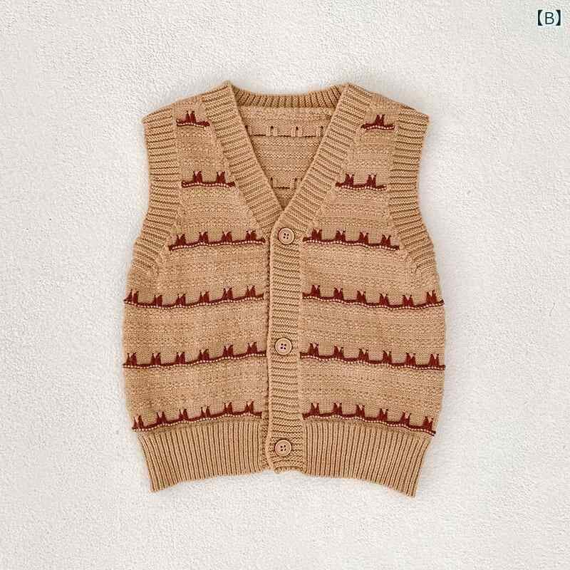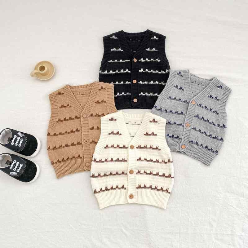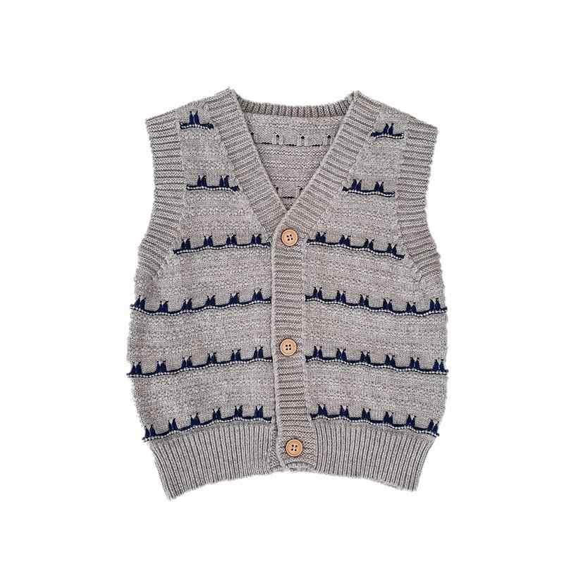 ベビー ニットベスト 男女兼用 カーディガン風 前開き 秋冬 ソフトタッチ クルーネック カジュアル デイリー かわいい ストライプ柄 グレー カーキ アイボリー