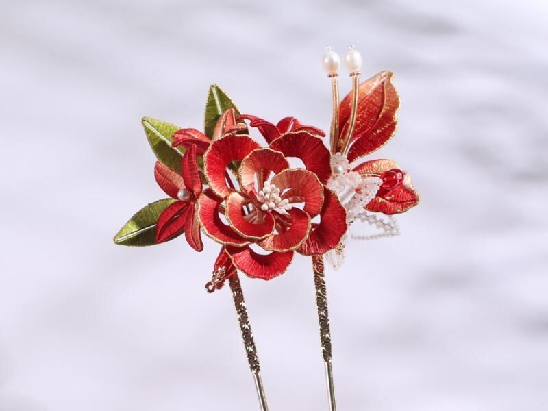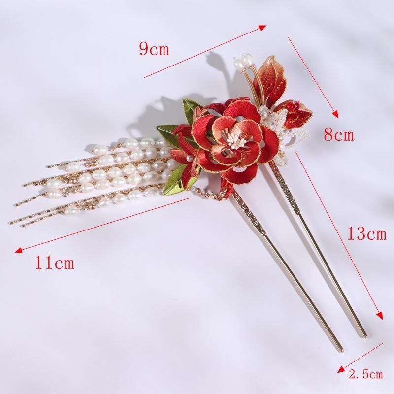 髪飾り レディース 中国風 漢服 古風 シルク ベロア 花 蝶 薔薇 赤色 タッセル かんざし ヘアピン 合金製 ハンドメイド 記念日 誕生日 イベント