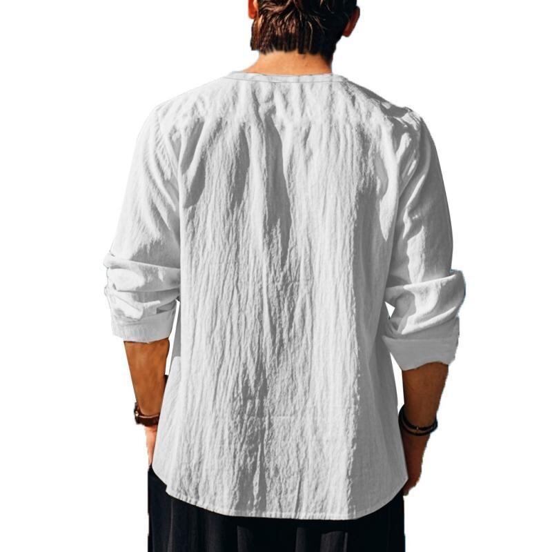 シャツ メンズ 男性用 Vネック 長袖 ゆったり ルーズフィット 無地 トップス 綿麻 コットンリネン プルオーバー ビーチ リゾート カジュアル 普段使い