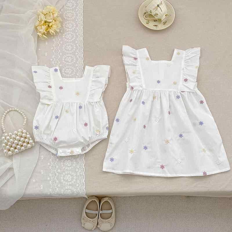 ワンピース ロンパース 女の子 夏 花柄 刺繍 プリンセスドレス ベビー服 キッズ 姉妹 お揃い コットン ノースリーブ Aライン 韓国風 柔らかい お出かけ 普段着 安心素材