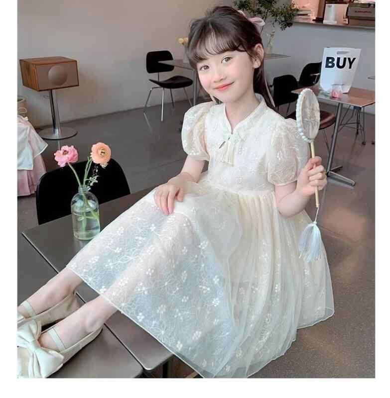 ワンピース 女の子 キッズ ガールズ 春夏 チャイナ風 漢服 プリンセスドレス 子供服 普段使い お出かけ おしゃれ かわいい エレガント 刺繡 ポリエステル 綿混紡 アプリコット