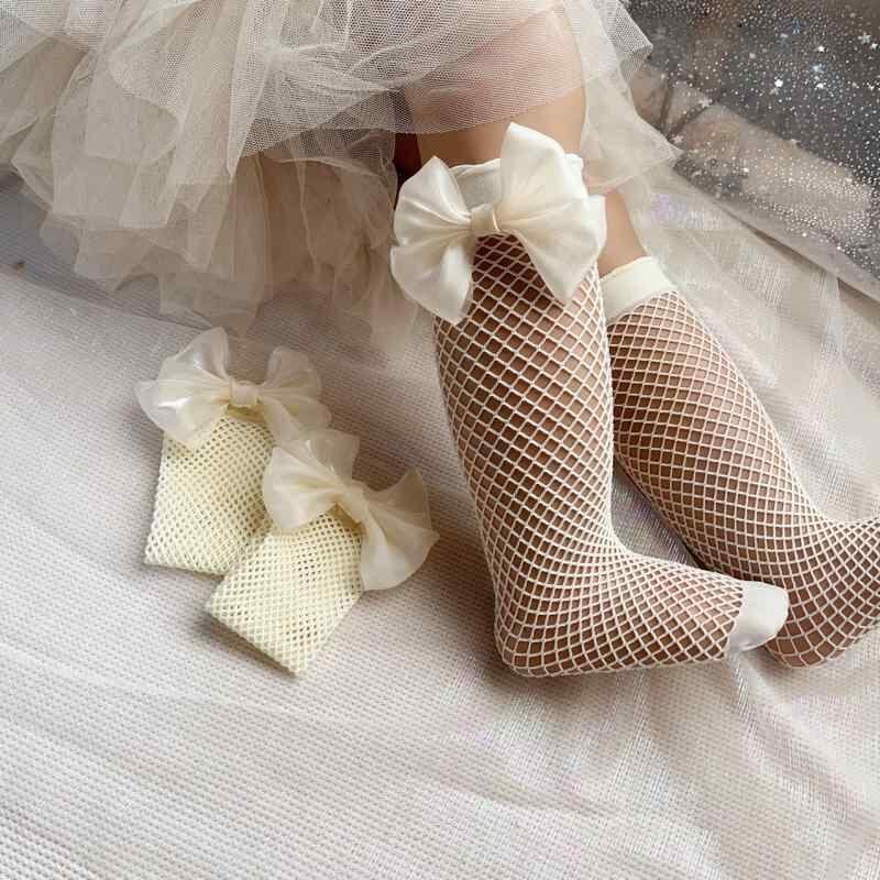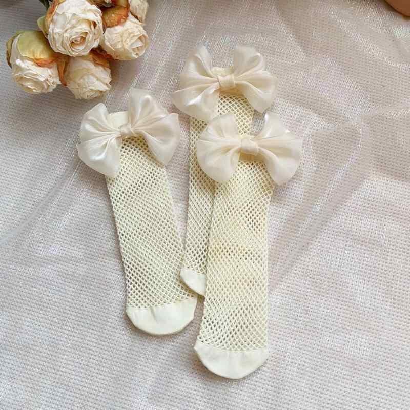 靴下 キッズ ロリータ サテン リボン 薄手 メッシュソックス 春夏 ミドル丈 クルー丈 かわいい オフホワイト ホワイト ブラック