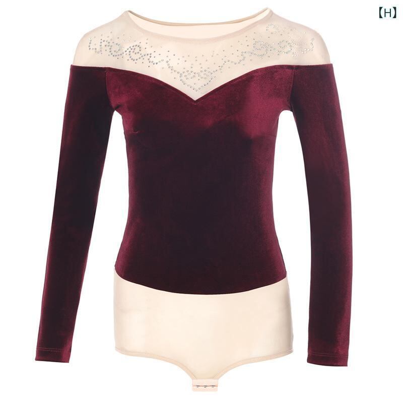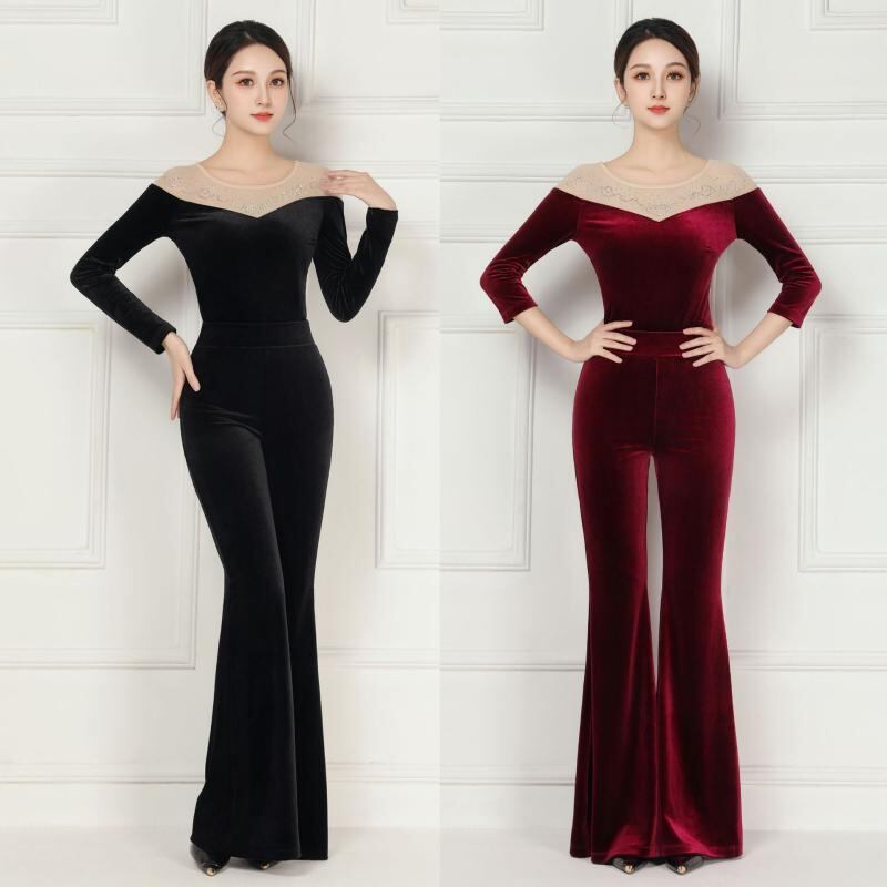 ダンスウェア レディース 秋冬 ベロア ラインストーン装飾 姿勢トレーニング フレアパンツ セットアップ 高級感 上質 舞台衣装 発表会 レッスン着 長袖トップス ブラック ワインレッド