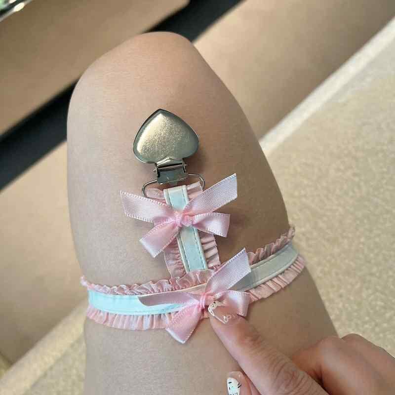 ガーターベルト レディース レース リボン フリル レザー調 レッグリング サイストラップ ハートチャーム メタルパーツ ダーク系 ゴシック 春夏