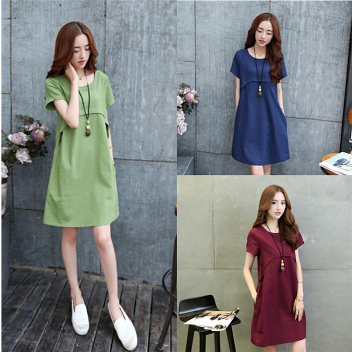 ワンピース マタニティ 妊婦服 半袖 ラウンドネック 無地 シンプル 韓国風 ゆったり リネン コットンブレンド 綿麻素材 ボルドー ワインレッド ドレス 普段使い