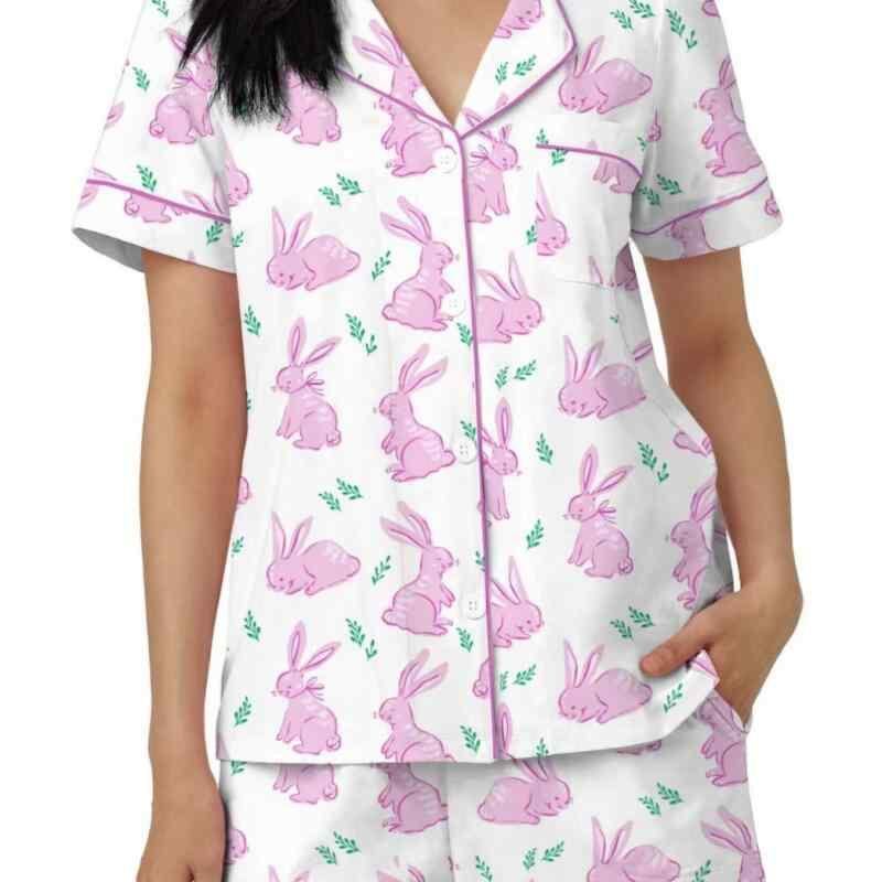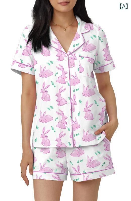 ルームウェア レディース 夏 パジャマ 半袖 ショートパンツ セットアップ 襟付き 薄手 ストレッチ 部屋着 ワンマイルウェア 外出OK 快適 大人可愛い ラビット柄 ストライプ柄 ポリエステル