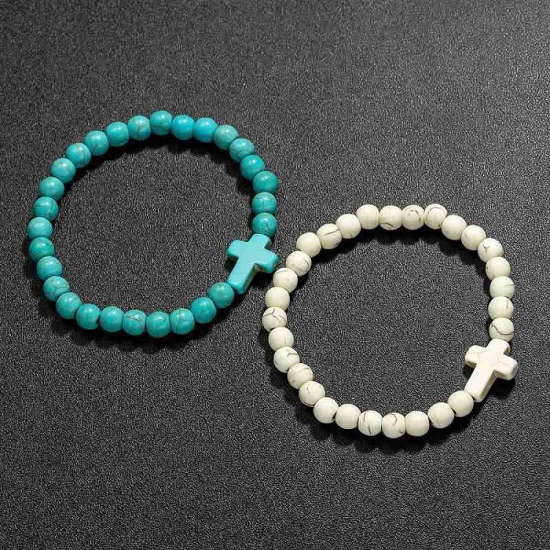 ブレスレット レディース 女性用 欧米風 レトロ ヴィンテージ ハンドメイド ツートンカラー 十字架 クロス ビーズ ダブルレイヤー ストレッチ 樹脂