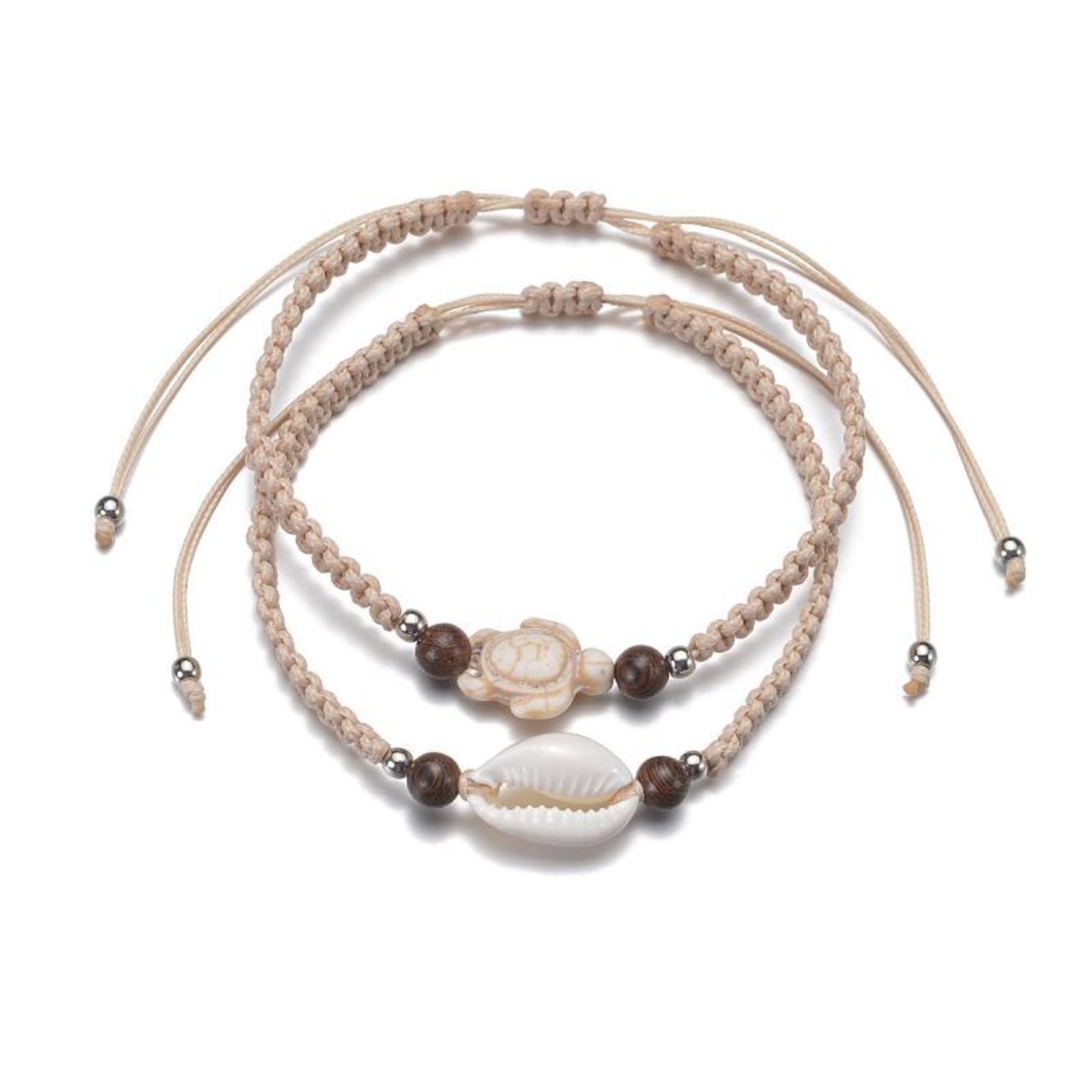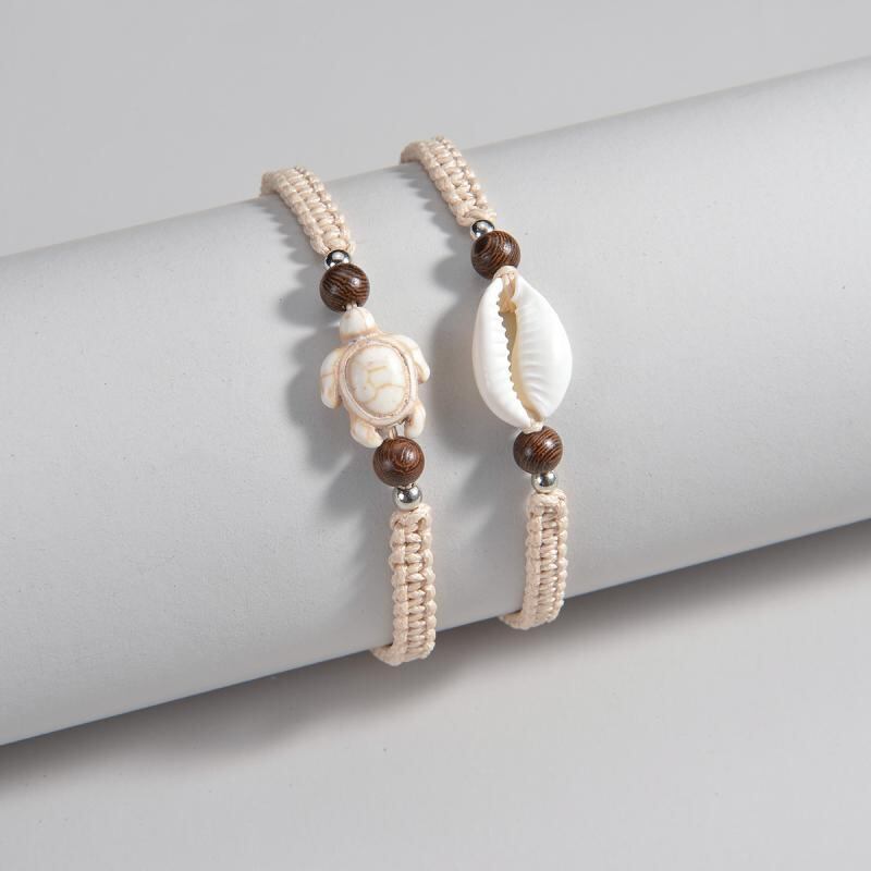 アンクレット 男女兼用 ボヘミアン エスニック ターコイズ ウミガメ シェル ウッドビーズ 防水 ワックスコード 編み込み 2点セット